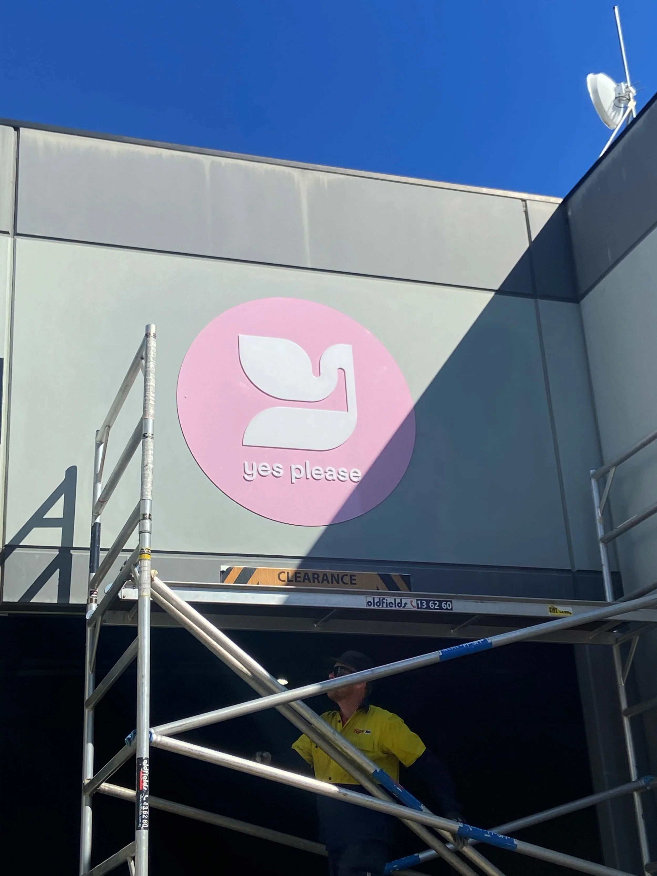 At the Yes Please office/warehouse, we decided signage was long past overdue. Delivery trucks weren’t able to see the small sign on the front door so we created a solution by installing two signs - one being our company logo which we placed on our signature pink to make it stand out from afar and a second sign directing drivers where to deliver packages.